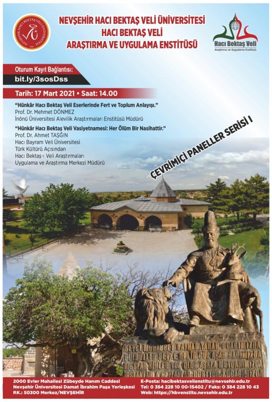 Üniversitemiz Hacı Bektaş Veli Araştırma ve Uygulama Enstitüsü tarafından 17 Mart 2021 Çarşamba günü, Prof. Dr. Mehmet Dönmez’in sunumuyla “Hünkâr Hacı Bektaş Veli Eserlerinde Fert ve Toplum Anlayışı” ve Prof. Dr. Ahmet Taşğın’ın sunumuyla “Hünkâr Hacı Bektaş Veli Vasiyetnamesi: Her Ölüm Bir Nasihattir.” konulu çevrimiçi panel serisinin birincisi düzenlenecektir.