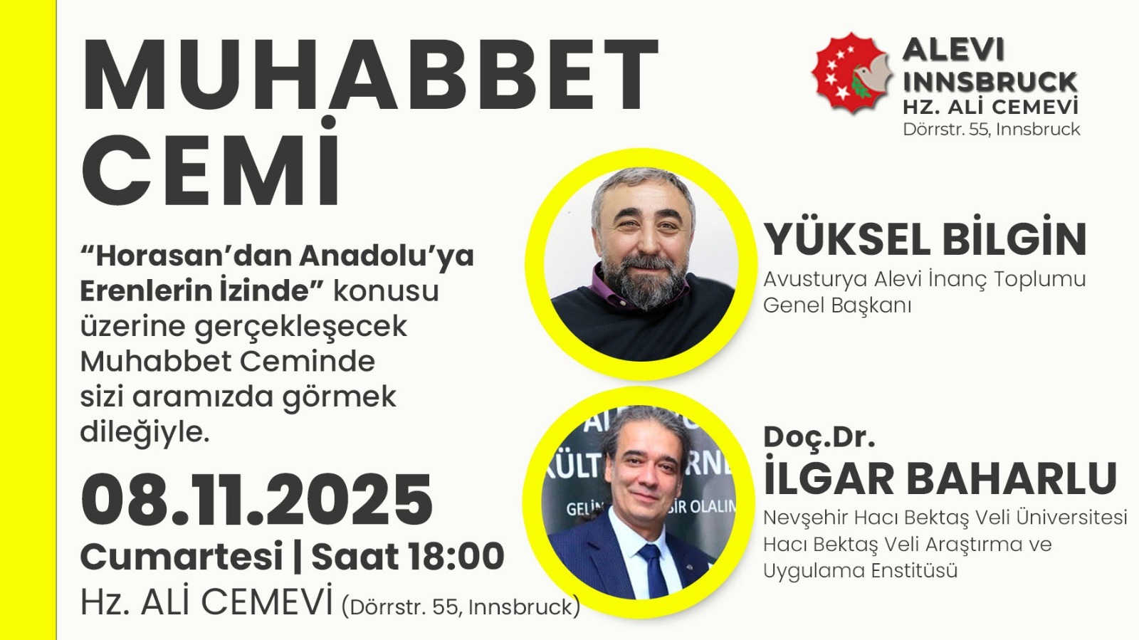 Hacı Bektaş Veli Araştırma ve Uygulama Enstitüsü Müdürü Doç. Dr. İlgar BAHARLU, 08.11.2025 tarihinde, Avusturya Innsbruck Hz. Ali Cemevi tarafından düzenlenecek olan "Horasan'dan Anadolu'ya Erenlerin İzinde" konulu Muhabbet Cemi'ne konuşmacı olarak katılacaktır.