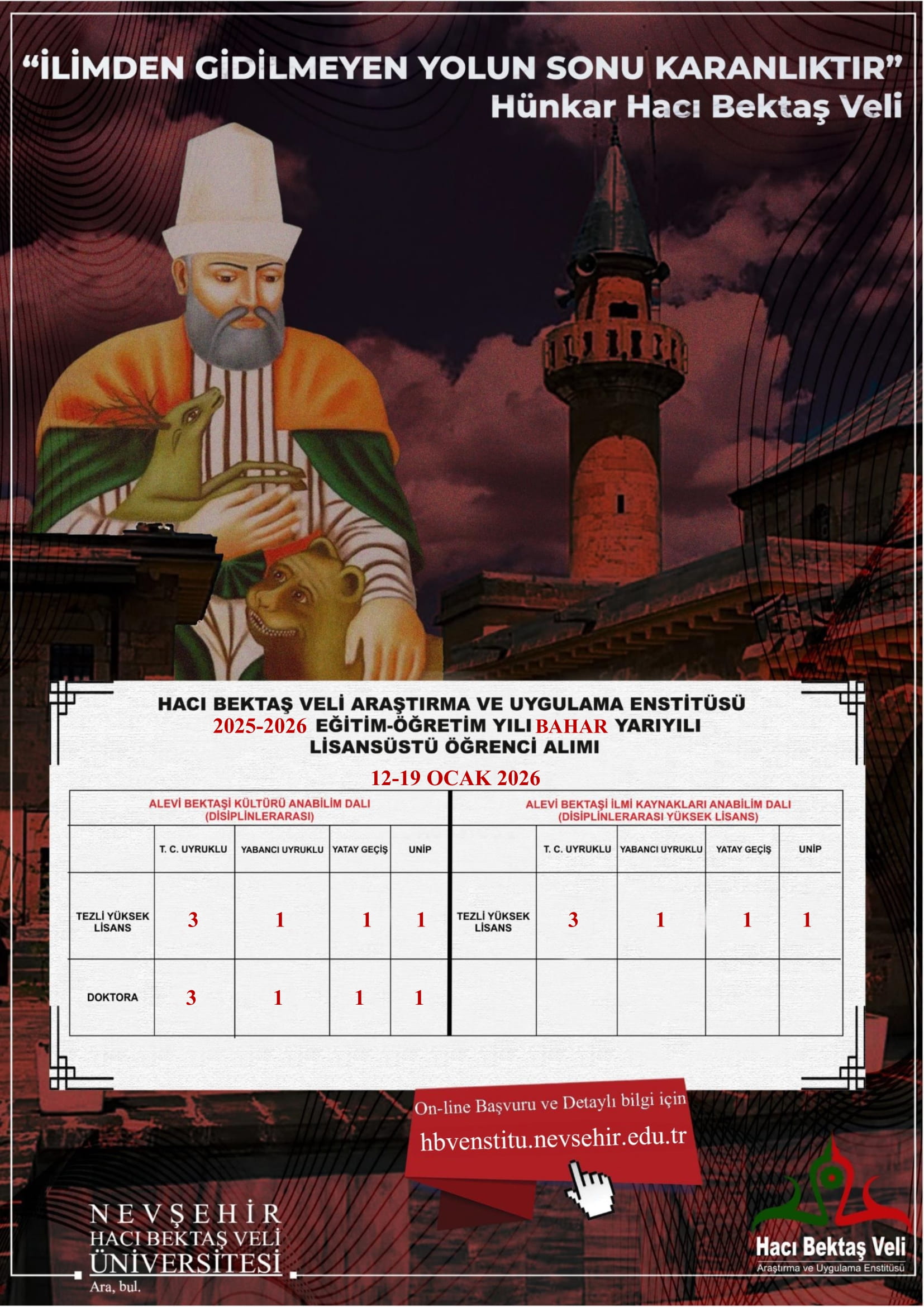 - Hacı Bektaş Veli Araştırma ve Uygulama Enstitüsü 2025-2026 Eğitim-Öğretim Yılı Bahar Yarıyılı Lisansüstü Öğrenci Alım İlanı